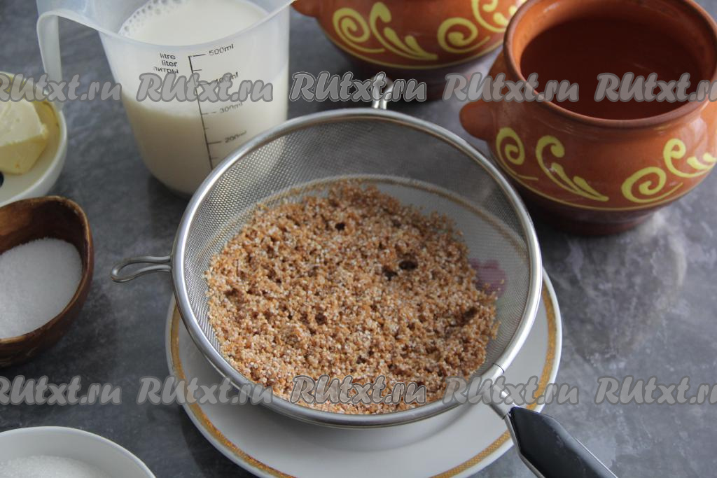 Пшеничную крупу хорошо промыть. Я высыпаю крупу в сито, промываю под проточной водой и оставляю на несколько минут, чтобы стекла лишняя жидкость.