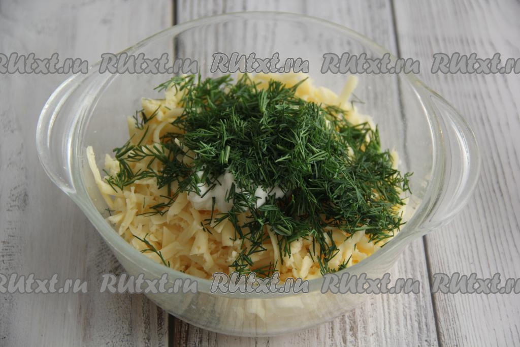 Прежде всего подготовим начинку, для этого в миске нужно соединить натёртый сыр, мелко нарезанный укроп и сметану.