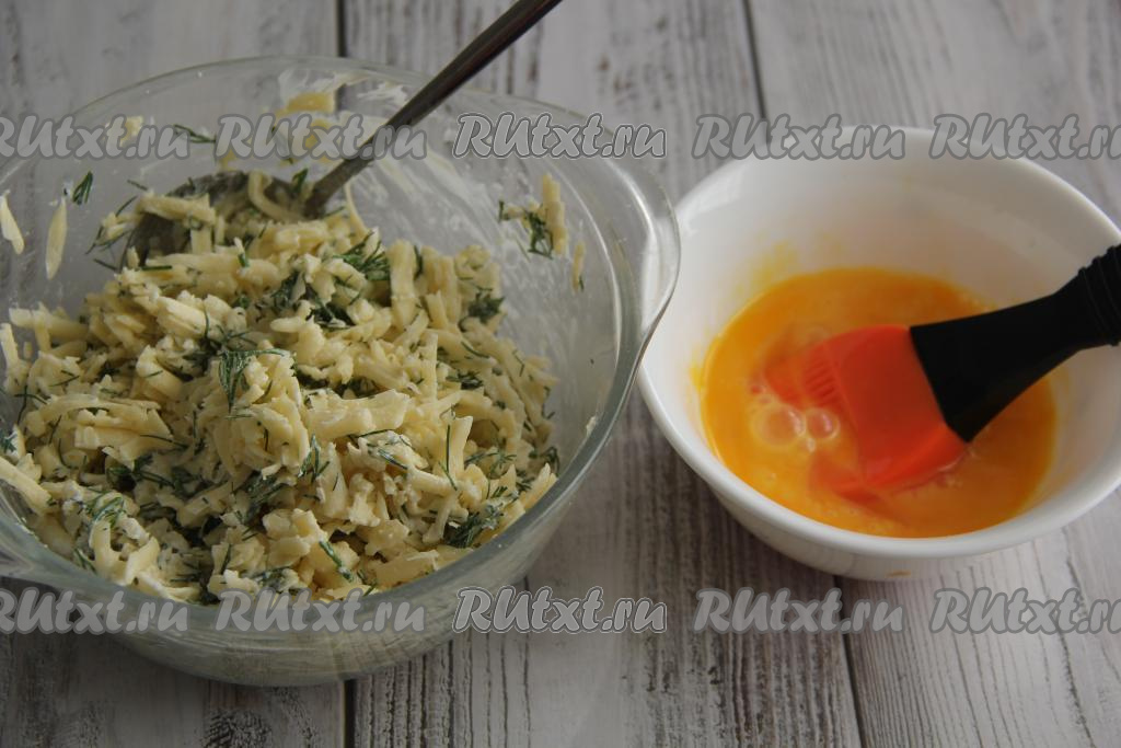 Перемешать сыр со сметаной и укропом, отставить начинку для чебуреков пока в сторону. В отдельной посуде взбить сырое яйцо вилкой.