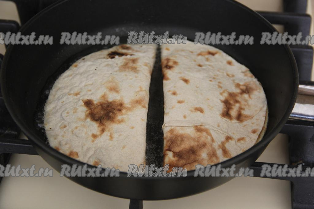 Сложить лаваш пополам и хорошо прижать края, получится чебурек в форме полумесяца. В сковороду влить масло и разогреть. Выложить по два чебурека в сковороду.