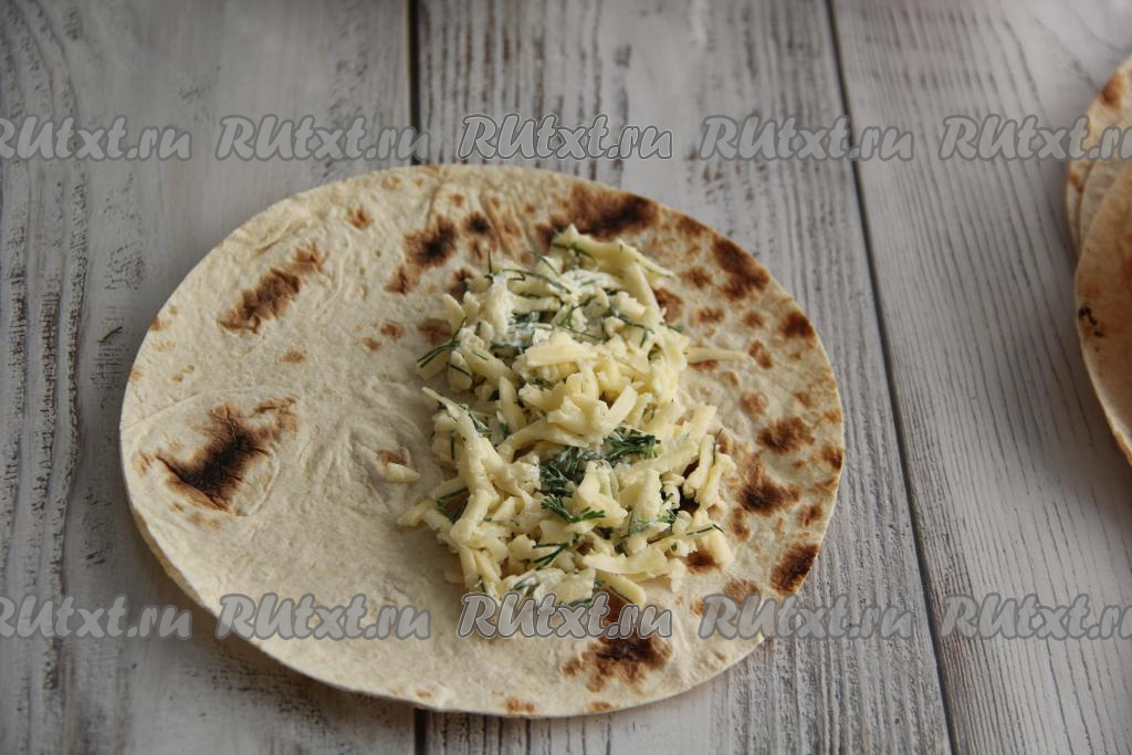Из лаваша вырезать круги. Я вырезала острым ножом круги из лаваша, приложив тарелку диаметром 18 см. Лучше всего исходить из диаметра вашей сковороды, так как в дальнейшем мы будем жарить чебуреки на сковороде. У меня получилось 8 заготовок. Подготовленную начинку я тоже разделила на 8 частей. Выложить на половину каждого круга лаваша часть начинки, немного отступив от края лаваша (как на фото).