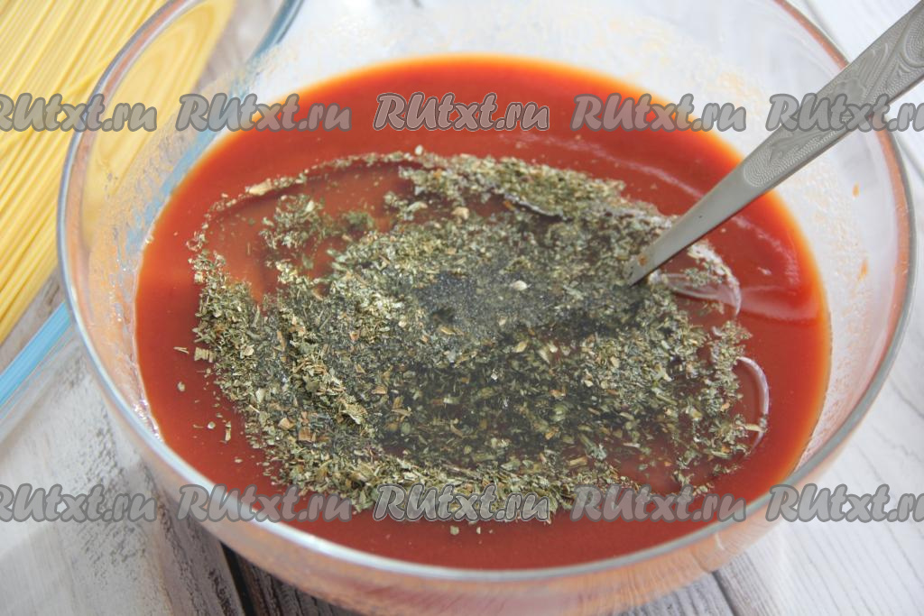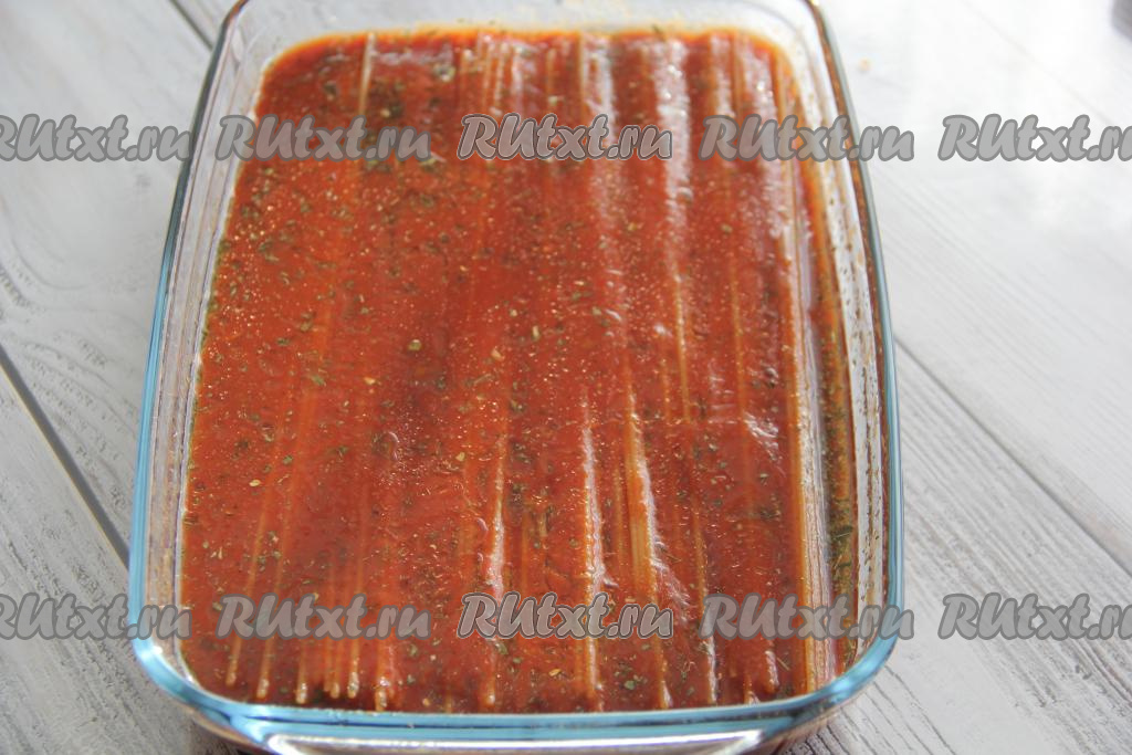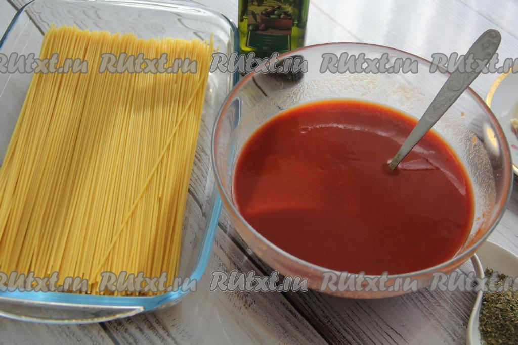Сухие спагетти выложить в жаропрочную форму. В отдельной миске соединить воду, томатную пасту и соль, хорошо перемешать получившийся томатный соус.