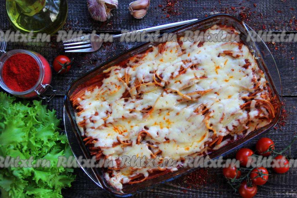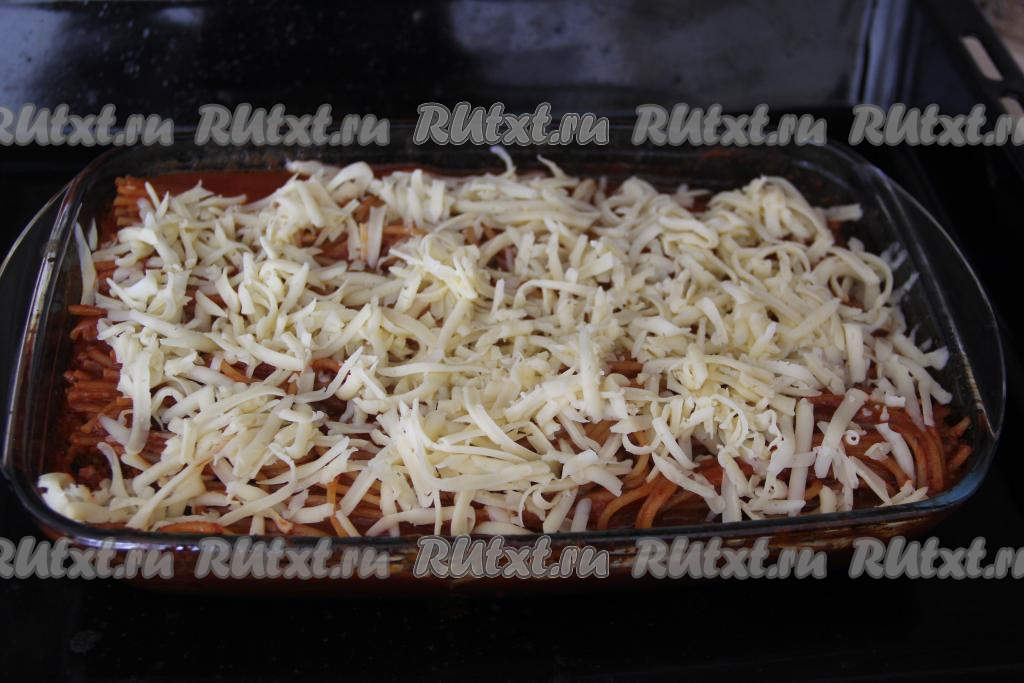 Поставить форму со спагетти в томатном соусе в разогретую духовку и готовить минут 25 при температуре 180 градусов. Затем достать форму, присыпать натёртым сыром и поставить обратно в духовку на минут 7-10 (до расплавления сыра).