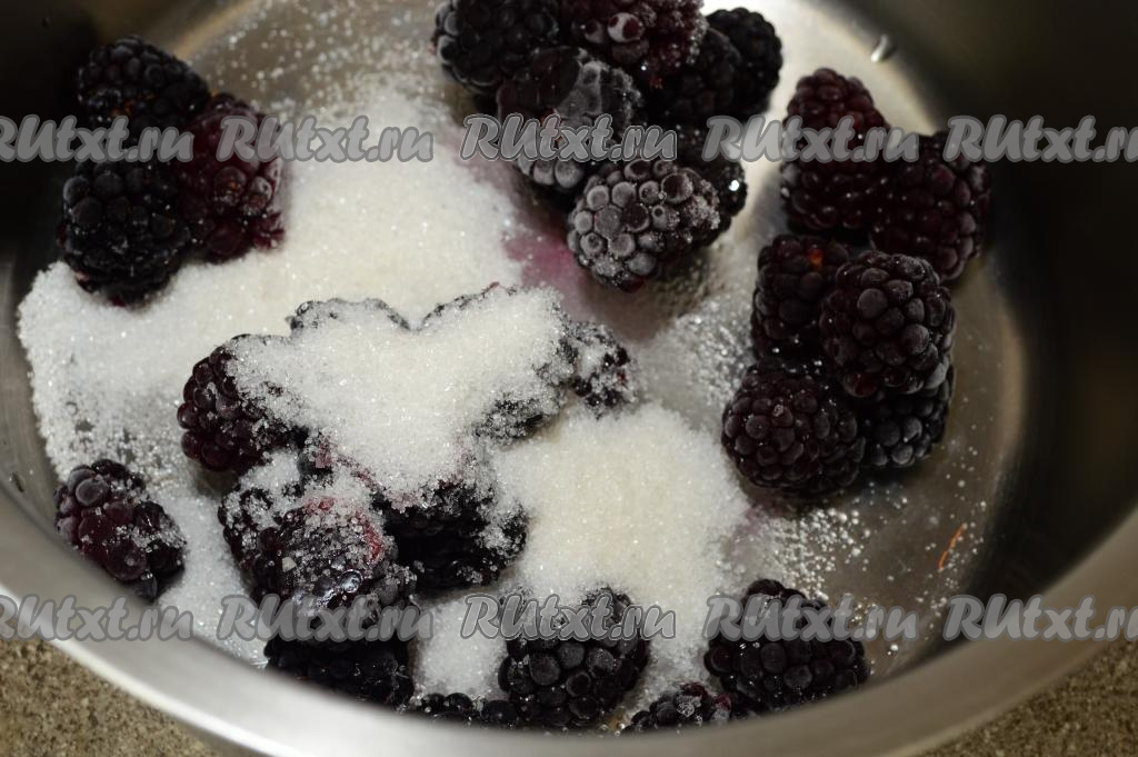 В кастрюлю выкладываем замороженную ежевику, сразу всыпаем сахар.