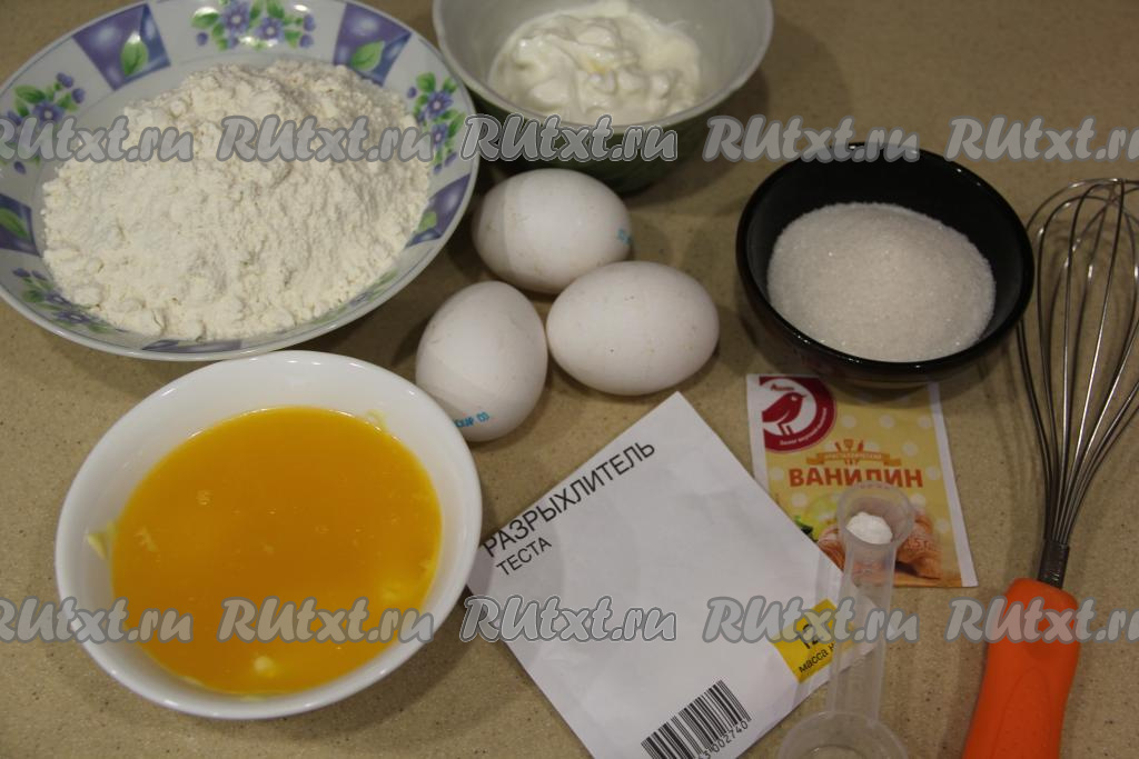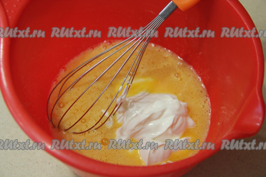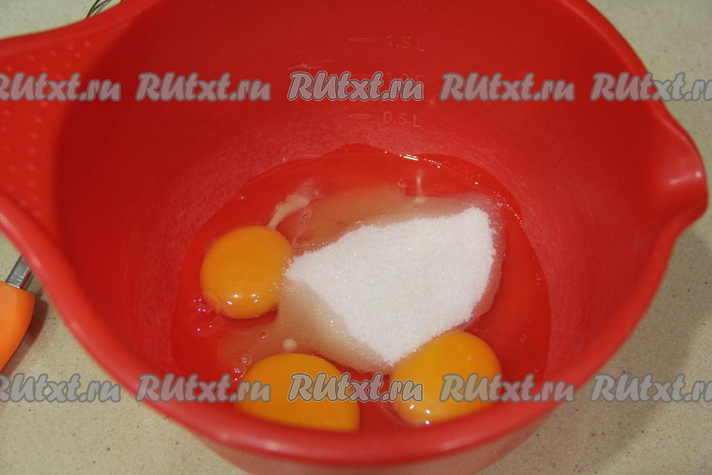 В глубокую миску вбить яйца, всыпать сахар и перемешать венчиком.