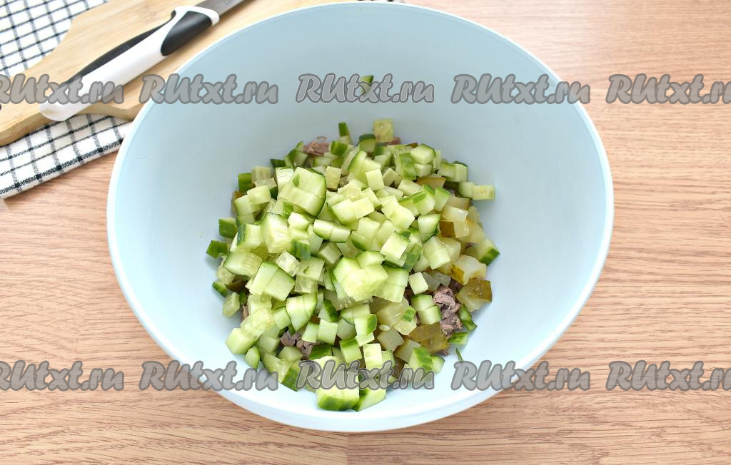 Аналогично нарезаем и свежий огурец, тоже перекладываем в миску.