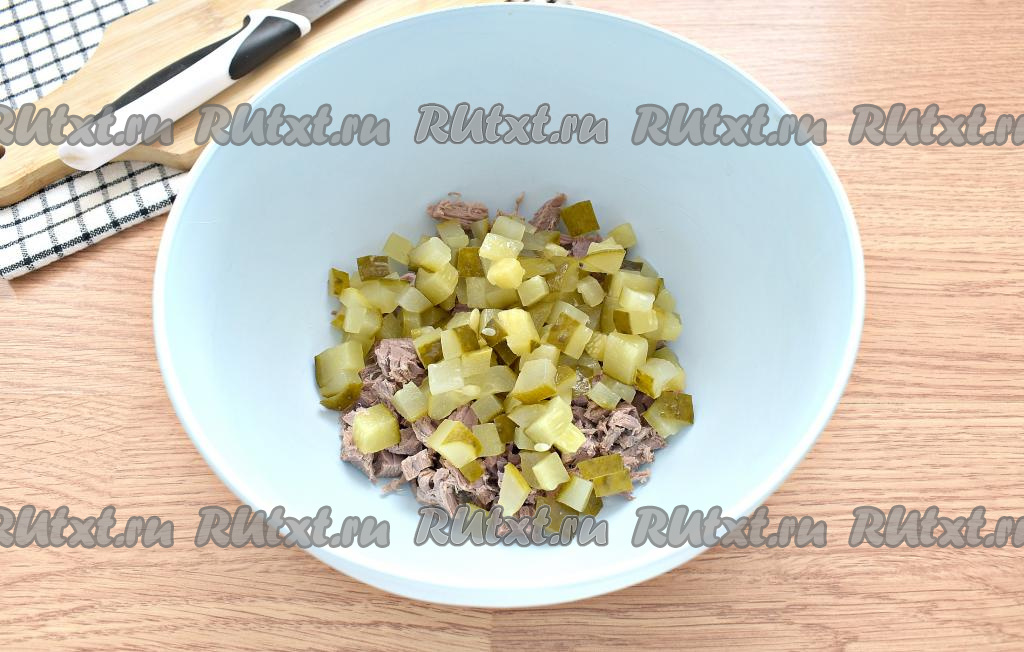 Для данного салата можно взять солёные или маринованные огурчики или, как у меня в этот раз, - маринованные и свежие. Маринованные огурчики нарезаем на кубики, примерно, такого же размера, как и мясо, добавляем в миску с говядиной.