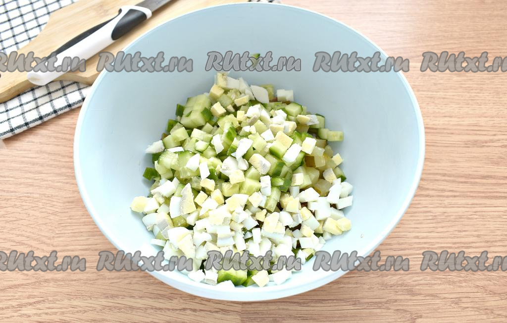 Сюда же добавляем и яйца, нарезанные на маленькие кубики.