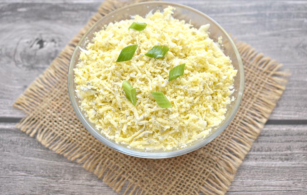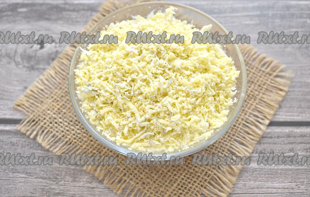 Завершающим слоем равномерно выкладываем натёртые на мелкой тёрке яичные желтки.