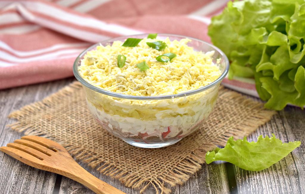 Рецептов салатов с крабовыми палочками немало. Предлагаю ещё один очень удачный рецепт такого салатика. В нём крабовые палочки отлично сочетаются с яйцами и плавленным сыром, а изысканный вкус салату придаёт кисло-сладкое яблоко. Блюдо получается нежнейшим. Этот слоёный салат можно приготовить не только для повседневного, но и для праздничного стола.