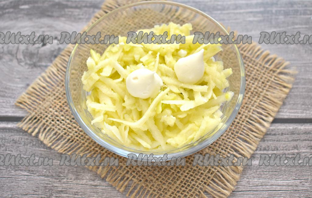Кисло-сладкое яблоко, очищенное от семян и кожуры, натираем на средней тёрке и выкладываем равномерно поверх белков, немного смазываем майонезом.