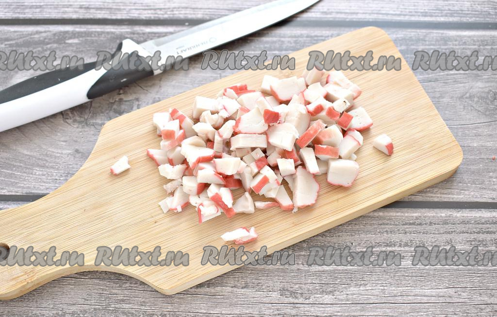 Если крабовые палочки заморожены, их нужно достать заранее, разморозить при комнатной температуре и вынуть из упаковки. Яйца для салата нужно сварить вкрутую (варить минут 8-10 после закипания воды), затем охладить в ледяной воде и очистить от скорлупы. Нарезаем крабовые палочки на мелкие кубики.