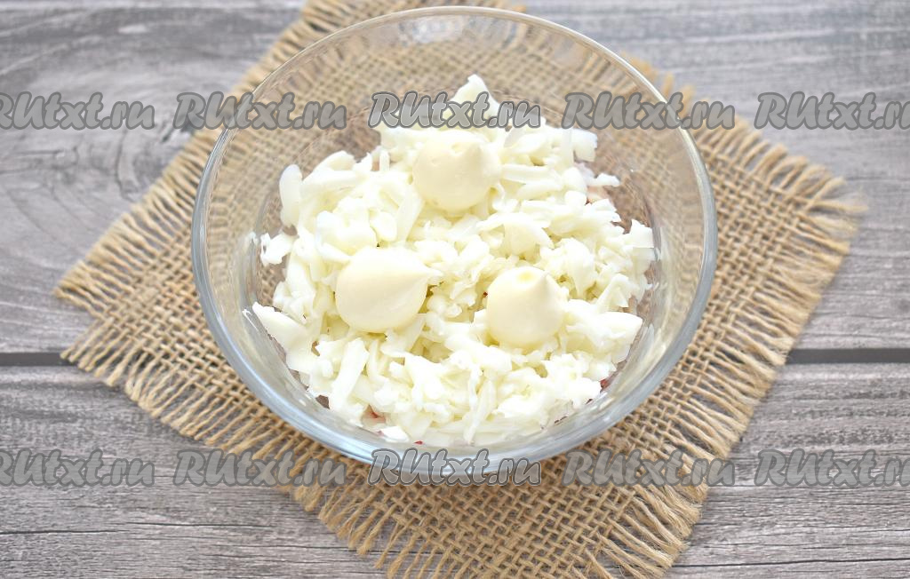 Плавленный сырок тоже натираем на среднеё тёрке, раскладываем поверх слоя яблок. Майонезом смазывать слой сыра не нужно.