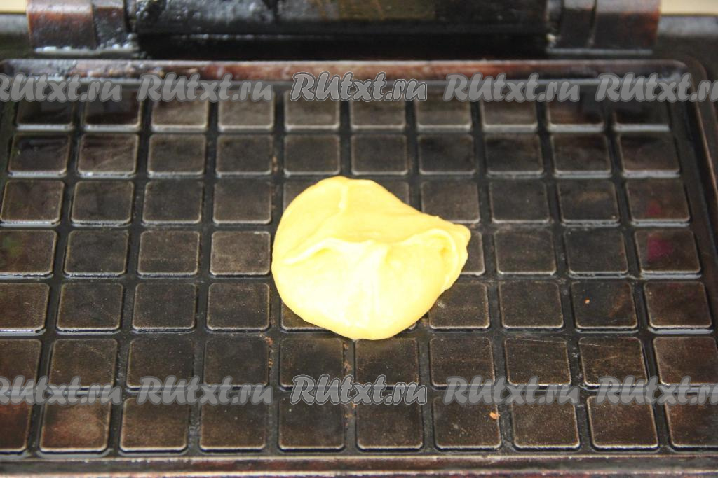 Перемешать тесто. Оно получится вязким, не жидким. Электровафельницу хорошо разогреть (маслом я смазывать не стала) и выложить 1 чайную ложку с горкой теста (количество теста может зависеть от размеров вашей вафельницы). Плотно закрыть створки вафельницы.