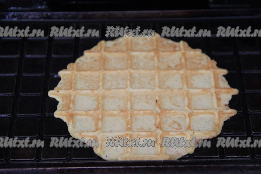 Жарить вафлю до золотистого цвета. Время жарки зависит от температуры разогрева вафельницы, поэтому ориентируйтесь по цвету вафли. Затем переложить на тарелку. Тесто перемешать и постепенно пожарить все вафельки.