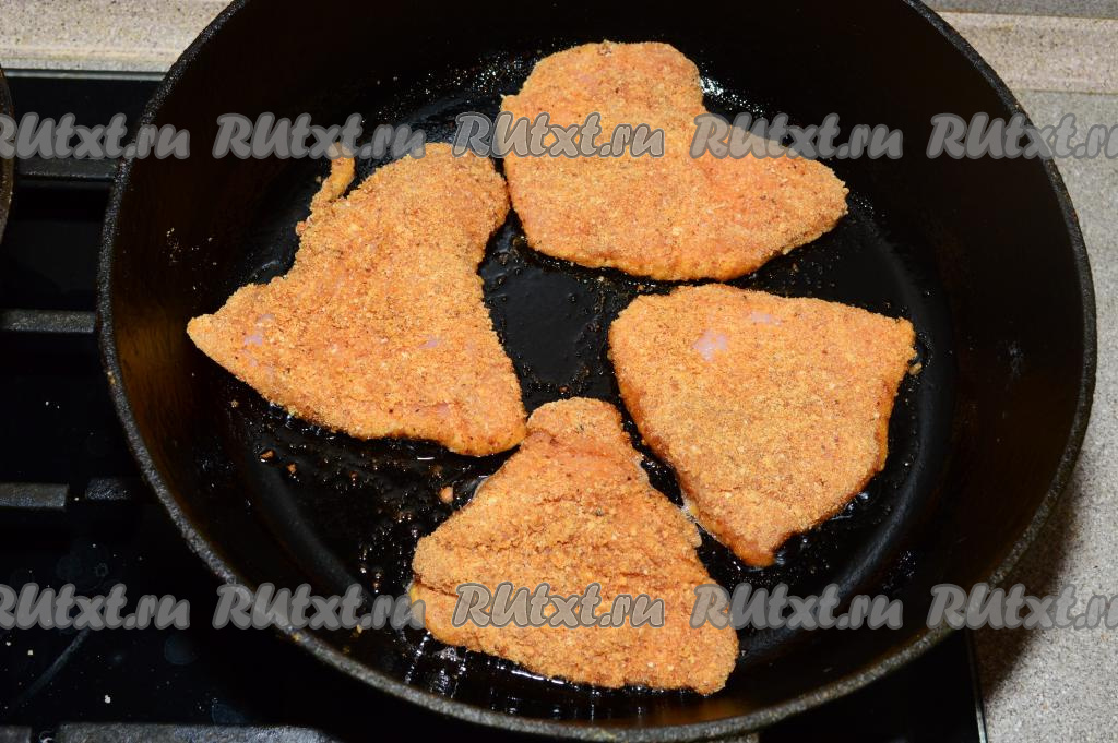 Сковороду поставить на сильный огонь и влить в неё растительное масло. Как только сковорода хорошо разогреется, выложить в один слой куриные отбивные, покрытые панировочными сухарями. Огонь сделать средним и жарить отбивные в течение 2-3 минут (до золотистого цвета).