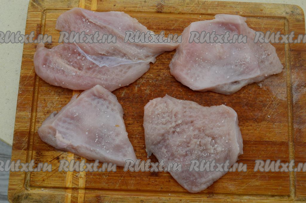 Куриное филе острым ножом нарезать на кусочки толщиной 1-1,5 сантиметра. 500 грамм куриного филе я обычно нарезаю на 7-8 кусочков. Затем кусочки мяса отбить кулинарным молоточком с одной стороны (до прозрачности отбивать не нужно), посолить.