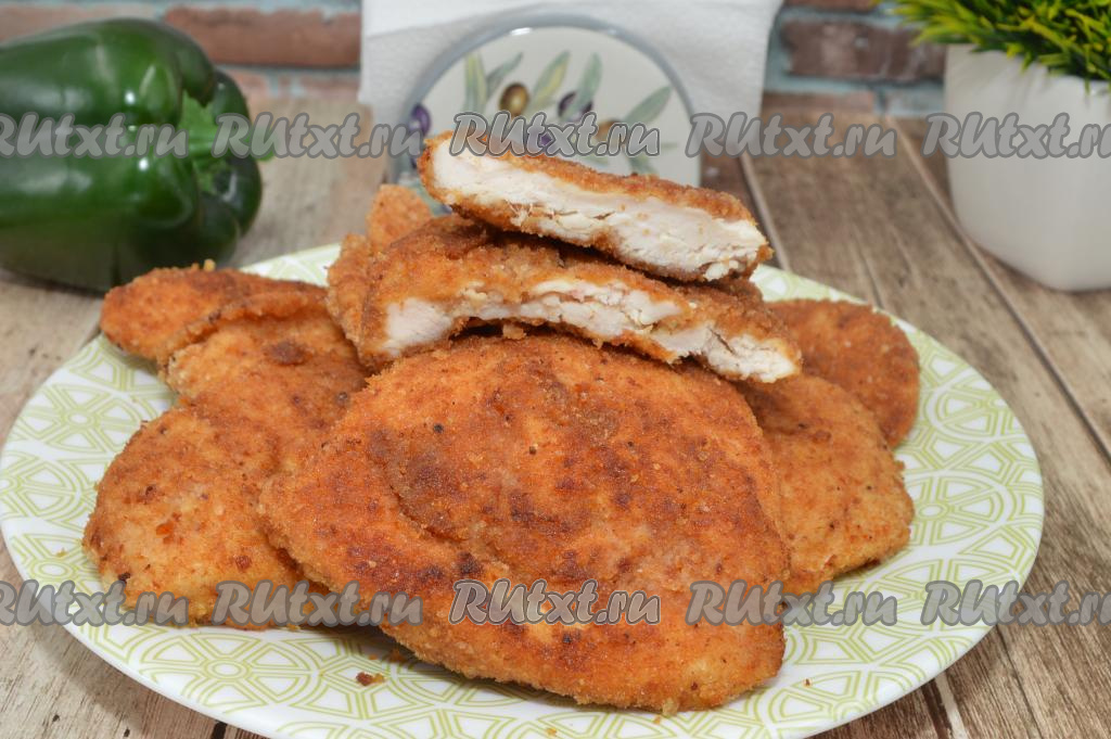 Посмотрите, какие сочные, аппетитные получились у меня отбивные из куриного филе, жаренные в панировочных сухарях на сковороде. Лучше всего их подавать в горячем виде, но и после остывания они очень хороши на вкус!