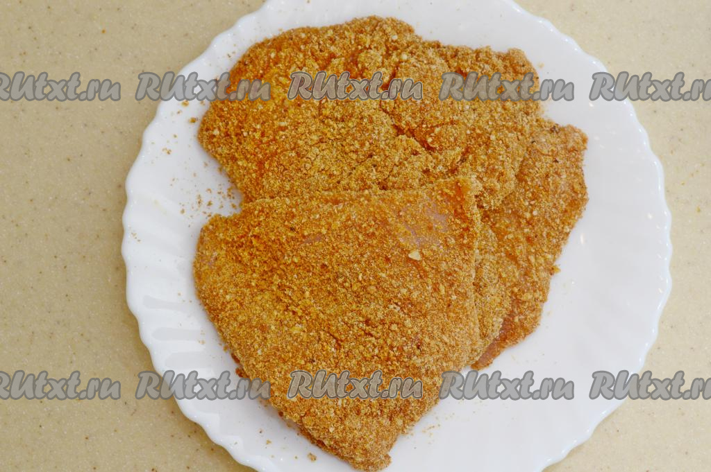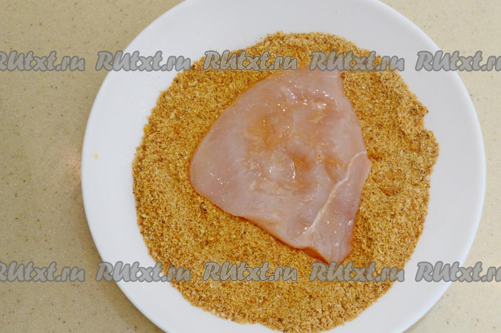 Насыпать на достаточно плоскую тарелку панировочные сухари. Доставать по одной отбивной из яичной смеси, обваливать в панировочных сухарях с двух сторон.