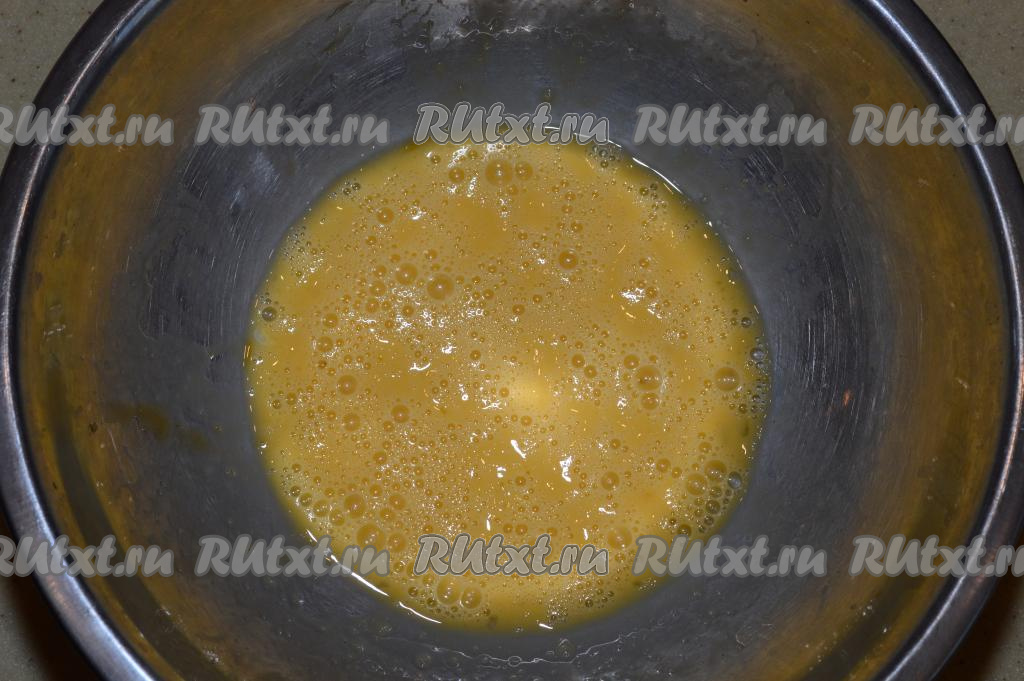 Куриные яйца вбить в глубокую миску и венчиком (или вилкой) перемешать их до получения однородной смеси.