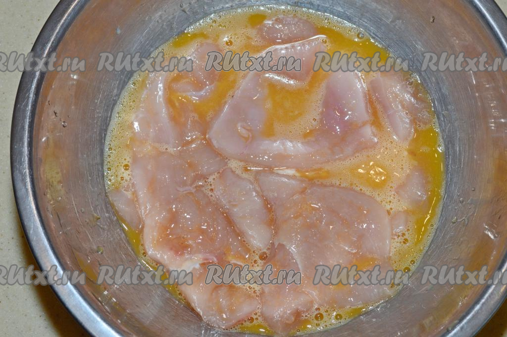 Выложить куриные отбивные в яичную смесь и хорошенько в ней "искупать" мясо со всех сторон.
