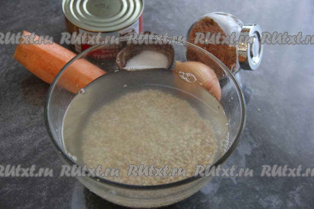 Прежде всего нужно хорошо промыть перловую крупу, затем переложить её в миску, залить чистой холодной водой и оставить на пару часов. Если времени мало, промытую крупу полностью залейте кипятком и оставьте минут на 30-40. Морковку и луковицу очистить.