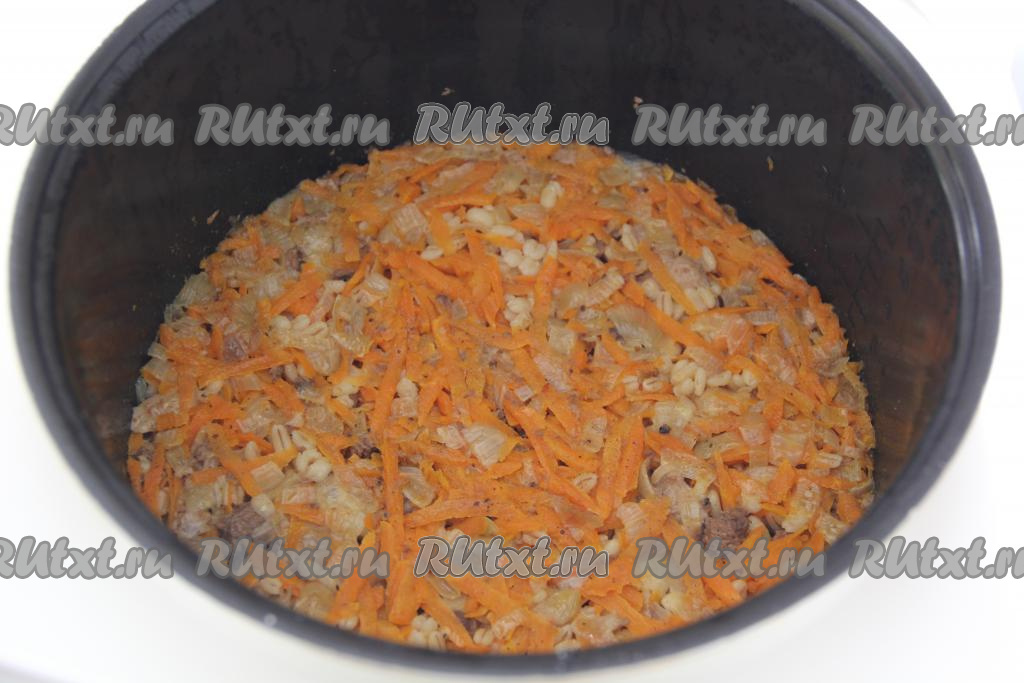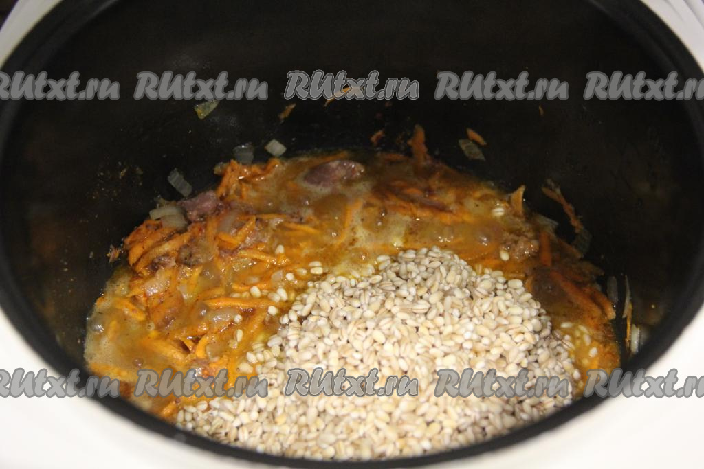 С перловой крупы слить лишнюю жидкость. Выложить перловку в чашу мультиварки к тушёнке с овощами.