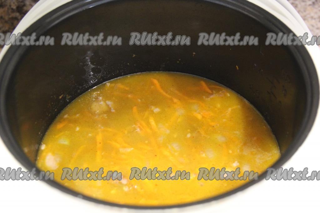 Влить в чашу мультиварки 700 миллилитров воды комнатной температуры, перемешать содержимое. Готовить блюдо под закрытой крышкой в течение 1 часа на режим "Тушение".