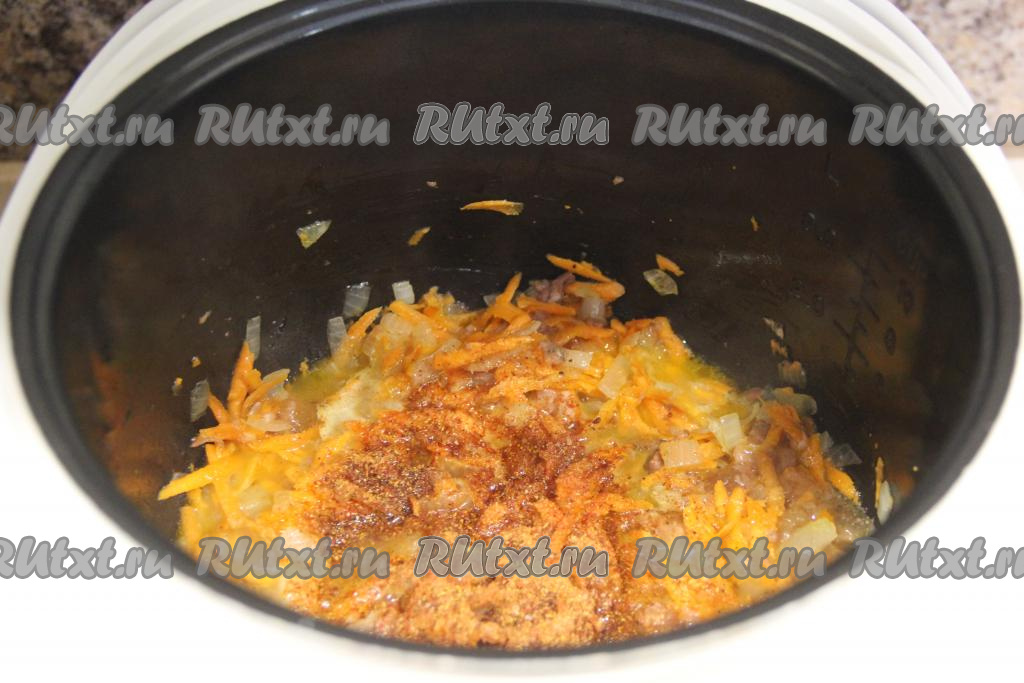Когда лук станет прозрачным, выложить в чашу мультиварки натёртую морковку, обжаривать, иногда перемешивая, до мягкости моркови (в течение 4-5 минут).