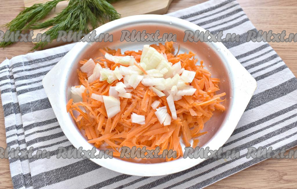 Очищаем морковку, зубчик чеснока и лук. Морковку натираем на средней тёрке, нарезаем достаточно мелко лук.