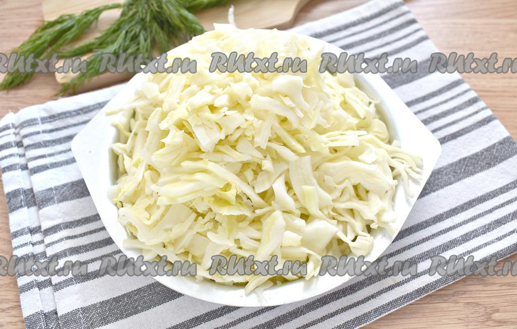 Нарезаем капусту на тонкие полоски. Если капуста жёсткая, её нужно добавить в кастрюлю вместе с картошкой и варить овощи вместе 20 минут. Если капуста не жёсткая, её нужно добавить в кастрюлю после того как картофель проварится 10 минут и варить овощи вместе 10 минут.