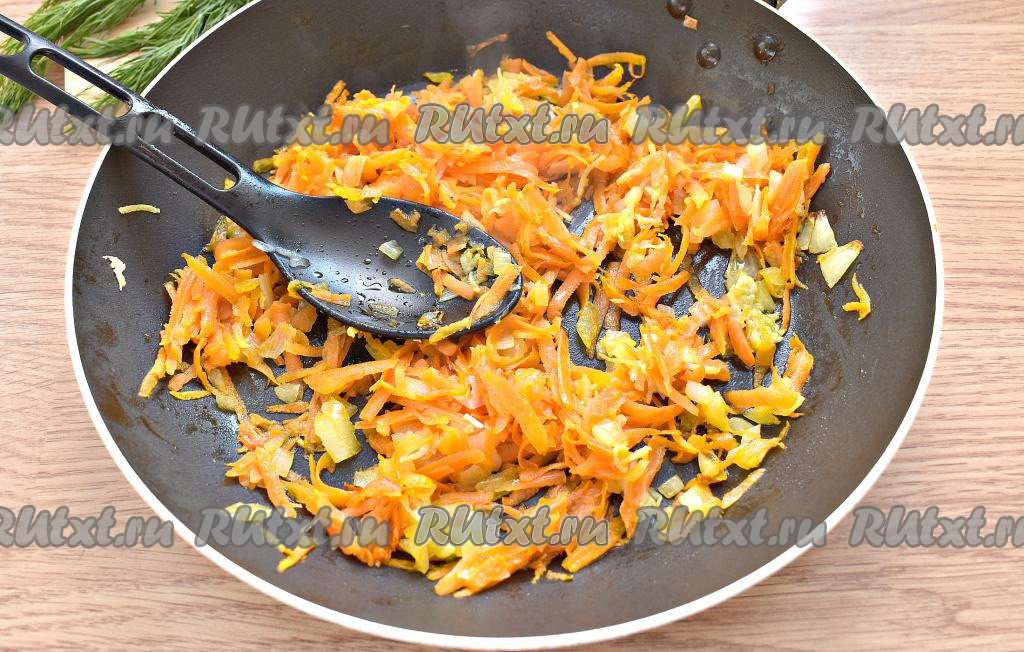 В сковороду вливаем растительное масло, немного его разогреваем, затем выкладываем лук с морковкой и пропущенный через пресс зубчик чеснока, перемешиваем и обжариваем, помешивая, минут 5 на среднем огне.