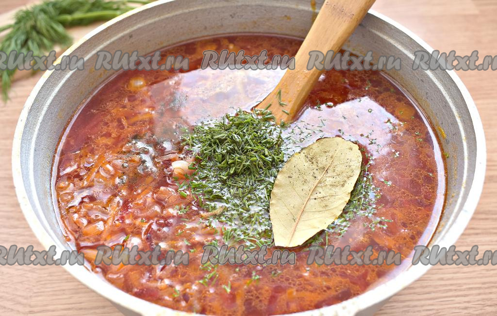 В конце приготовления пробуем постный борщ на вкус, перчим, если нужно, подсаливаем, добавляем нарезанную зелень и лавровый листик, после закипания провариваем на минимальном огне 1-2 минуты. Снимаем кастрюлю с огня, накрываем крышкой и даём борщу настояться минут 10.