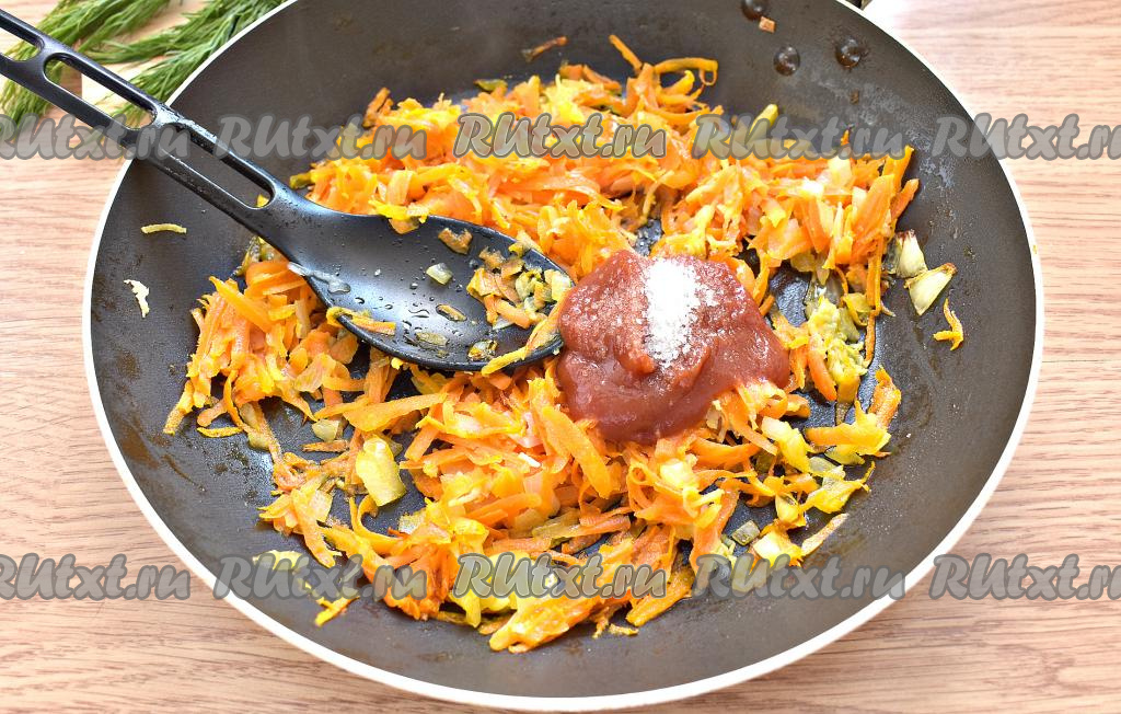 Выкладываем томатную пасту к обжаренным овощам, если паста кислит, добавляем сахар, перемешиваем, вливаем пару столовых ложек овощного бульона из кастрюли. Томим овощи на небольшом огне 5-7 минут.
