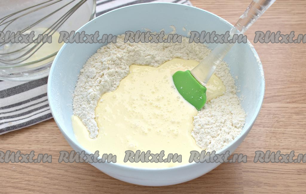 В миску со смесью сухих ингредиентов вливаем молочно-масляную смесь, тщательно перемешиваем тесто лопаткой.