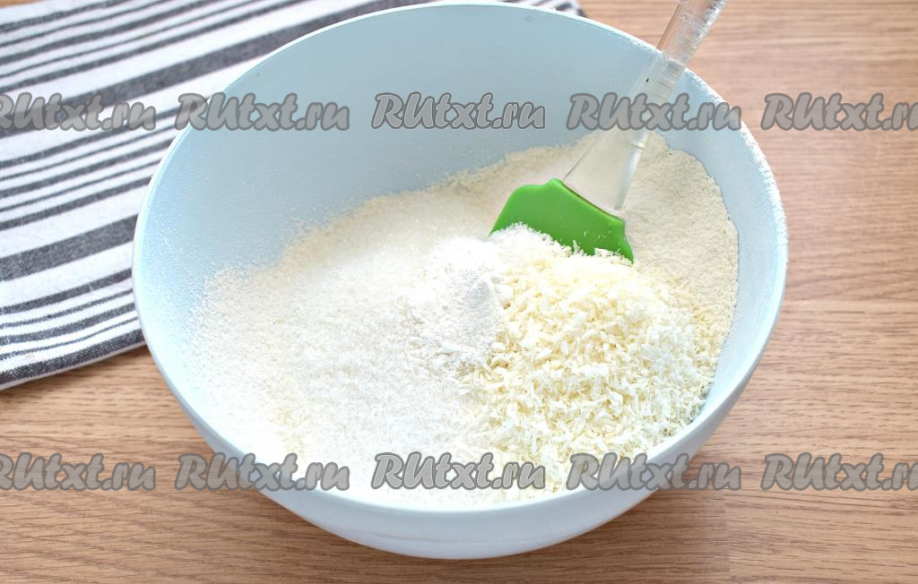 Добавляем в муку разрыхлитель, 45 грамм кокосовой стружки и сахар.