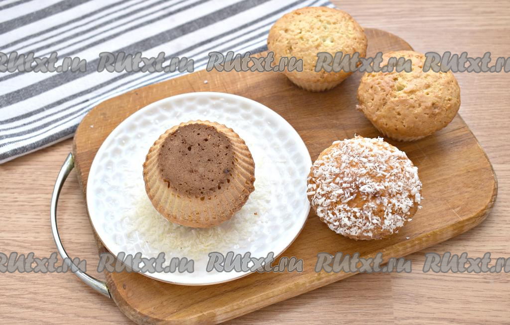 Формочки с тестом ставим на противень, отправляем на 35 минут в духовку, заранее прогретую до 180 градусов. Румяную выпечку достаём из духовки. Маффины, приготовленные с добавлением кокосовой стружки, получаются пышными, ароматными и очень вкусными. Даём им остыть, затем достаём из формочек.