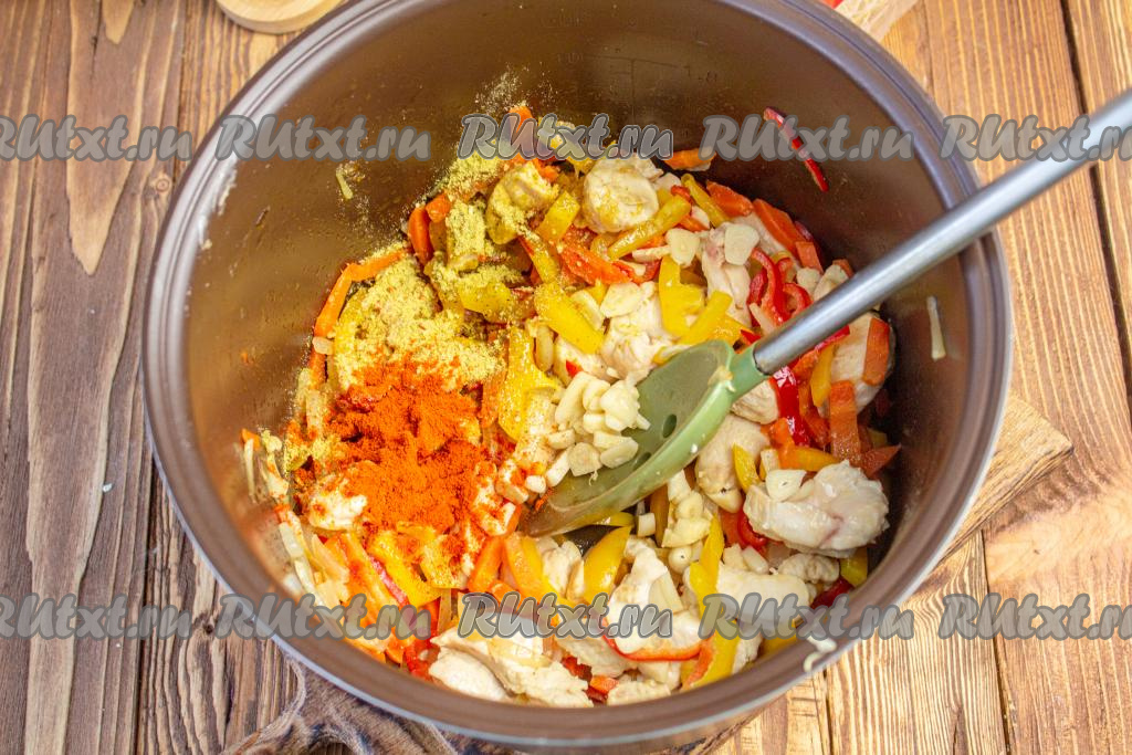 Чеснок очистите и нарежьте тонкими пластинами. Добавьте его в мультиварку, всыпьте приправу для курицы и паприку, перемешайте.