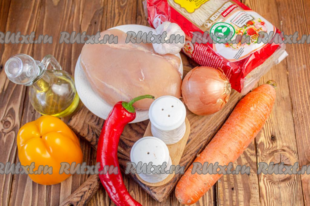 Для удобства фунчозу можно нарезать ножницами на более короткую лапшу. Выложите её в мультиварку к овощам и курице.