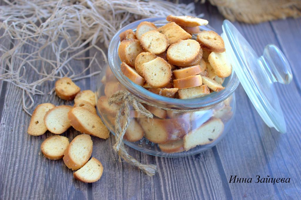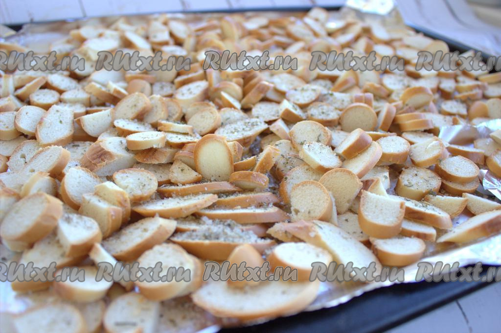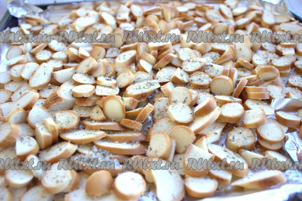 Хорошо перемешать и поставить в разогретую до 180 градусов духовку на 3 минуты. Затем выключить духовку и оставить сухарики в закрытой духовке на 5-7 минут.