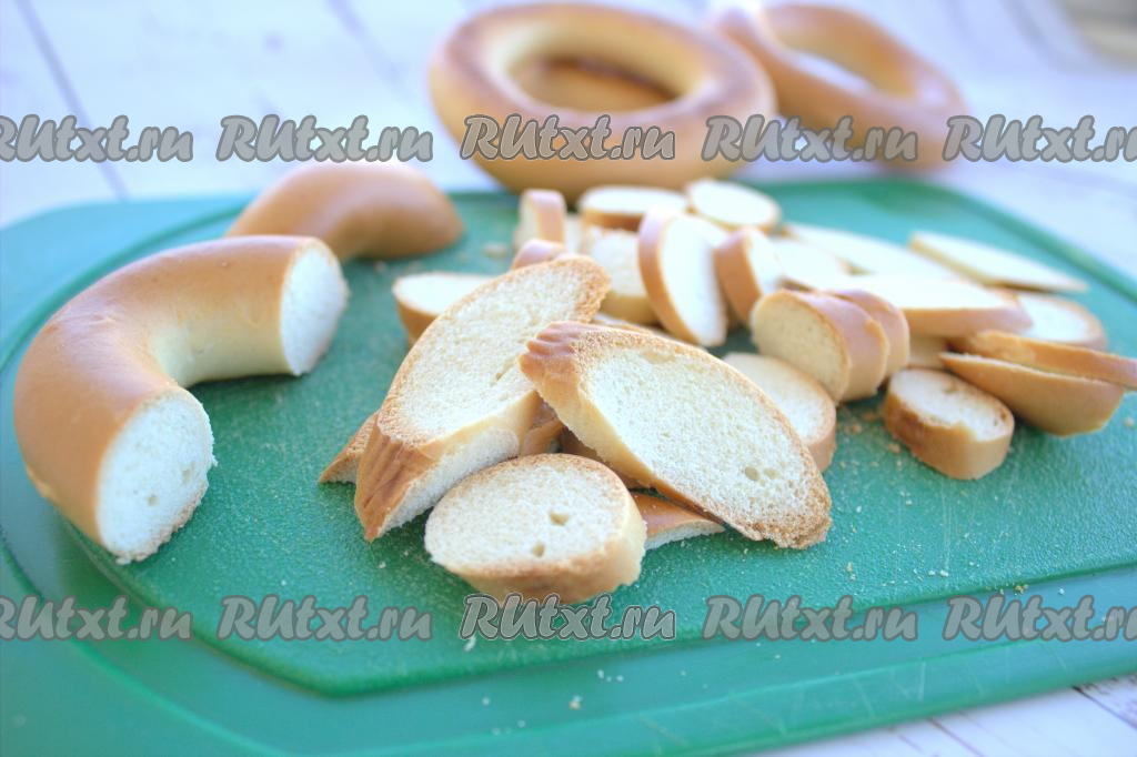 Каждую баранку для удобства разрезать пополам, а затем нарезать на кружочки толщиной, примерно, 0,5-1 сантиметр.