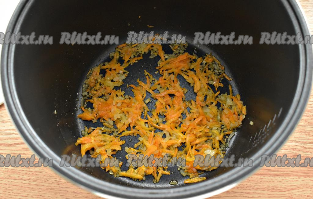 В чашу мультиварки (у меня - мультиварка Редмонд) вливаем растительное масло. Включаем программу «Жарка» на 15 минут. Когда масло прогреется (прозвучит звуковой сигнал), выкладываем в чашу мультиварки морковку с луком, обжариваем их, не накрывая крышкой и периодически перемешивая, минут 5.
