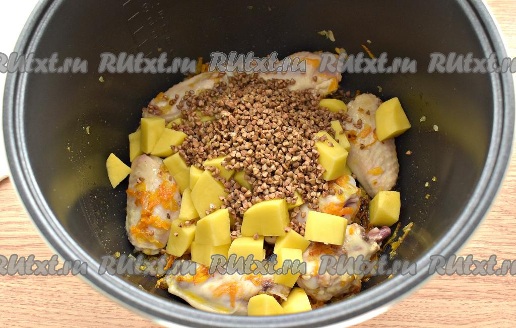 Гречку перебираем, удаляя чёрные зёрнышки, затем несколько раз промываем. Перекладываем промытую гречку в чашу мультиварки, солим.