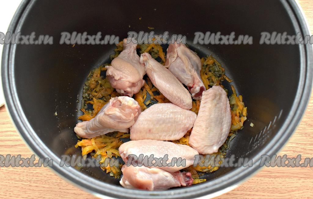 К обжаренным овощам добавляем части куриных крылышек (или другие части курочки), перемешиваем, обжариваем, периодически перемешивая и не закрывая крышку, 10 минут.