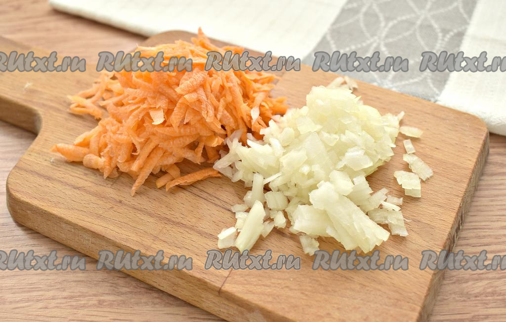 Очищаем морковку и натираем её. Очищаем половину луковицы и нарезаем на маленькие кусочки.