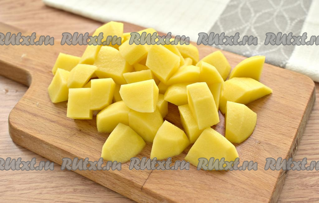 Очищаем картофель и нарезаем его на небольшие кубики.