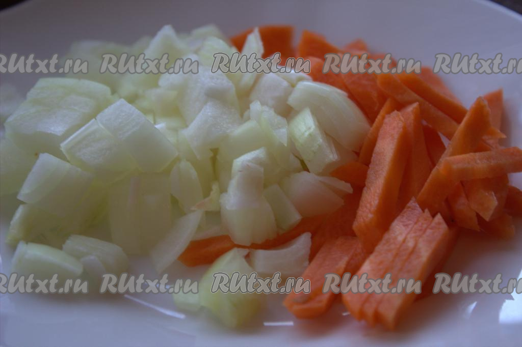 Очистить морковь, помыть и нарезать на брусочки небольшого размера. Очистить луковицу и нарезать достаточно мелко.