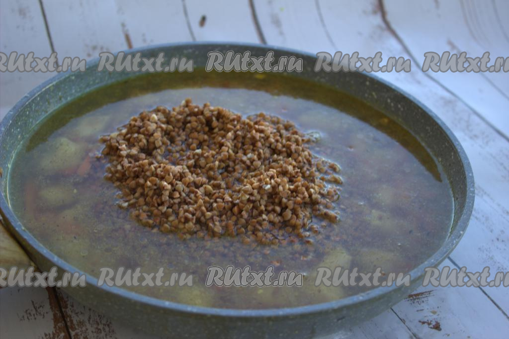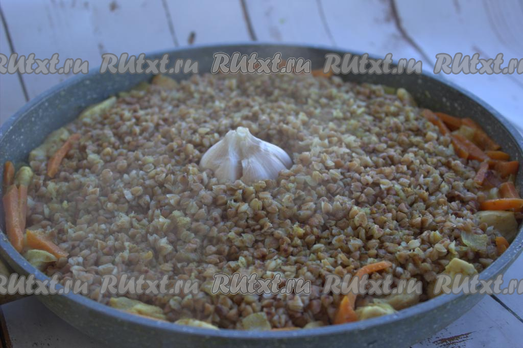 В сковороду с курицей и овощами выложить промытую гречку, влить 500 мл тёплой воды, разровнять гречку.