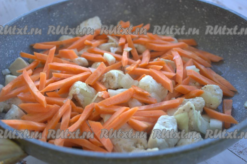 Далее в сковороду добавить брусочки моркови, хорошо перемешать и обжаривать овощи с куриным мясом до мягкости морковки (минут 5), периодически перемешивая.