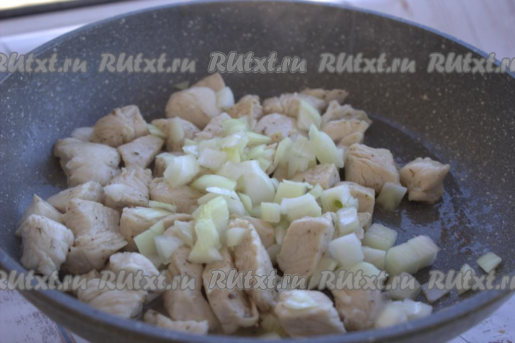 Затем в сковороду с обжаренной курицей выложить нарезанный лук, перемешать и, уменьшив огонь до среднего, обжаривать минуты 3, не забывая периодически помешивать.